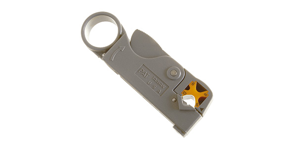 Wire stripper for coaxial cables. This tool has two separately regulated blades that allow for easy displacement of both the cable’s core and its outer sheath in one operation, leaving the conductor ready for termination.